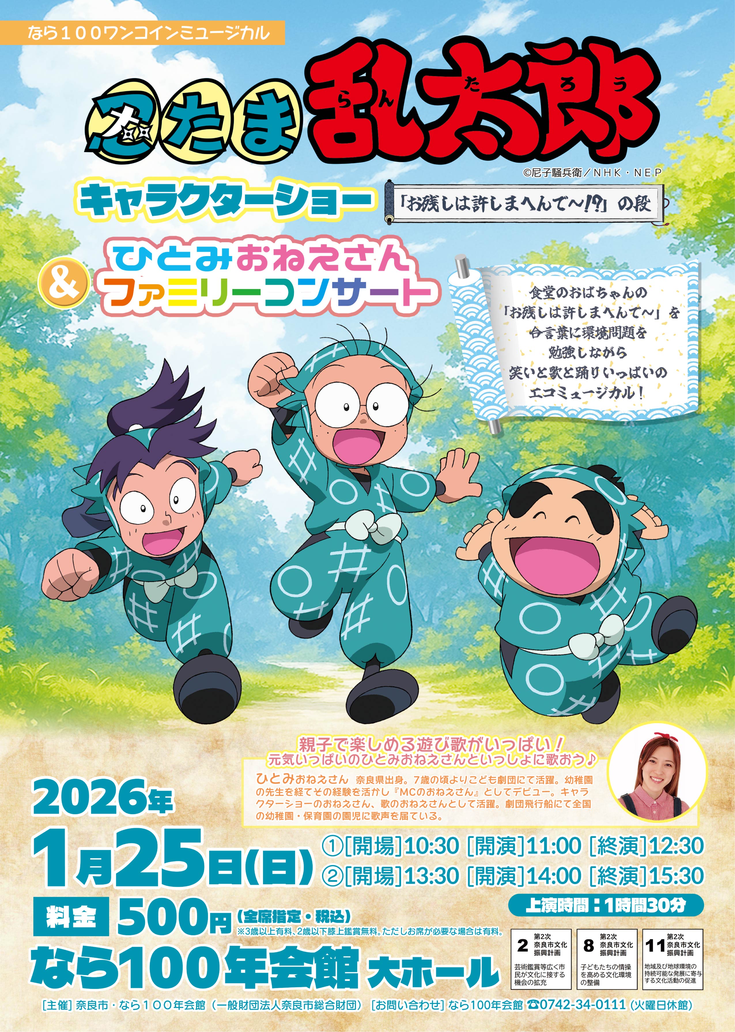 2025年10月26日 イベント情報 なら100ワンコインミュージカル 忍たま乱太郎 キャラクターショー「お残しは許しまへんで~!?」の段 食堂のおばちゃんの「お残しは許しまへんで~」を合言葉に、環境問題を勉強しながら笑いと歌と踊りいっぱいのエコミュージカルをお楽しみください!ひとみおねえさんのコンサートでは、一緒に歌って遊びましょう♪ 開催場所:なら100年会館 大ホール 日時 2026年1月25日(日) ①午前11時~午後0時30分(開場:午前10時30分)②午後2時~3時30分(開場:午後1時30分) ★料金やチケット発売日等の詳しいことは、こちらからどうぞ★