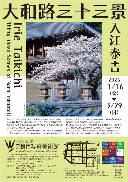 2026年1月15日 イベント情報 大和路三十三景 -入江泰𠮷- 長年にわたって奈良の風景を撮影し、その静かな魅力を伝えてきました。今回の展示では、1970年代から1990年までに撮影されたカラー作品を中心に奈良の33ヶ所のの名所をご紹介します。 開催場所:入江泰吉記念奈良市写真美術館 開催期間 2026年1月16日(金)~3月29日(日) 料金 通常観覧料が必要です(「第六回 入江泰吉記念写真賞 作品展」もご覧いただけます) 詳しくはこちらから。入江泰𠮷記念奈良市写真美術館公式ホームページ