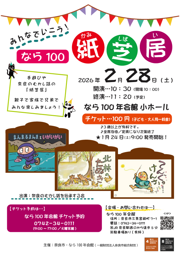 2026年1月25日 イベント情報 なら100ふれあいコンサートシリーズ「なら100紙芝居」 奈良に伝わる昔話を、紙芝居仕立てでお届けします。親子で、家族で、兄弟で、みんな一緒にお話を楽しみましょう!手遊びの時間もありますよ♪ 開催場所:なら100年会館 小ホール 開催日時 2026年2月28日(土) 開演:午前10時30分(開場:午前10時)※終演は11時20分頃を予定 料金 3歳以上:100円 チケット申し込みについて 予約はこちらから。なら100年会館 チケット予約0742-34-0111詳しくはこちらから。なら100年会館公式ホームページ 備考:スポーツ保険料が別途必要です(加入は任意です)
